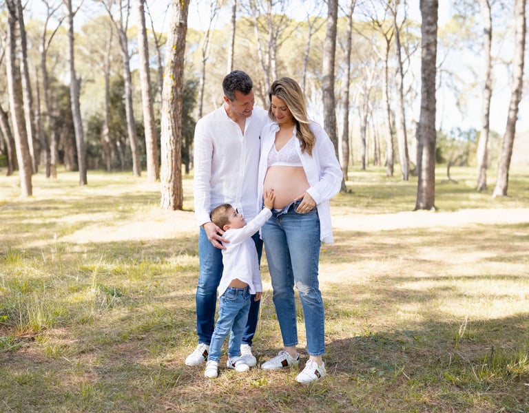 Puedes hacer la sesión sola, en pareja o con otros hijos y mascotas. Cada sesión se adapta para crear un recuerdo tierno y real de esta etapa irrepetible.